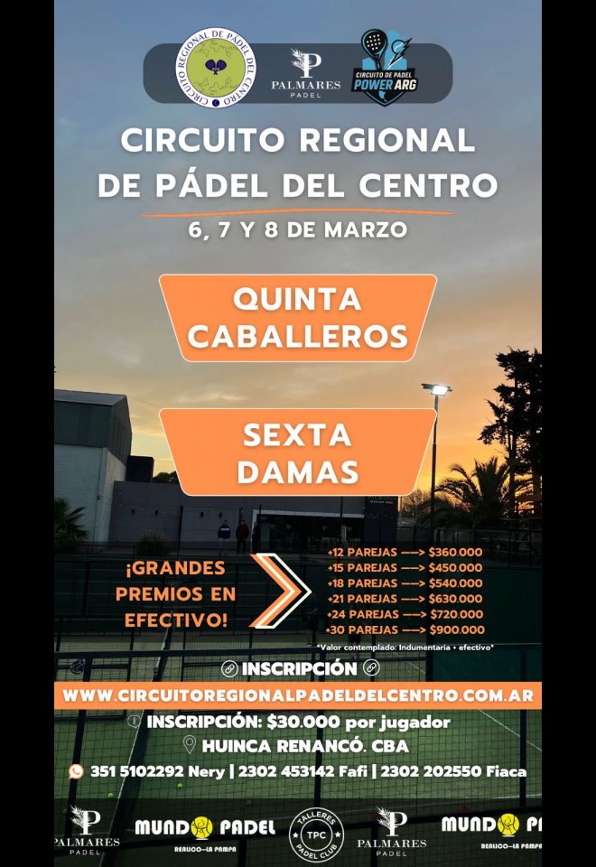 »» Evento: 5TA CABALLEROS - 6TA DAMAS / PALMARES PADEL »» Localidad: Huinca Renancó »» Fechas: 06/03/2026 al 08/03/2026